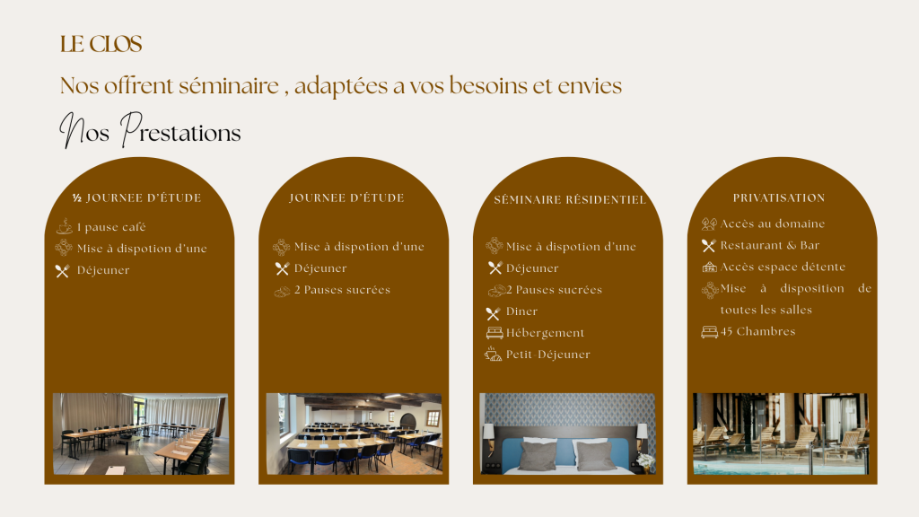 Que vous organisiez une réunion à la journée, un séminaire résidentiel, une formation sur plusieurs jours ou un événement d’entreprise, notre équipe vous accompagne dans la création d’une formule personnalisée.